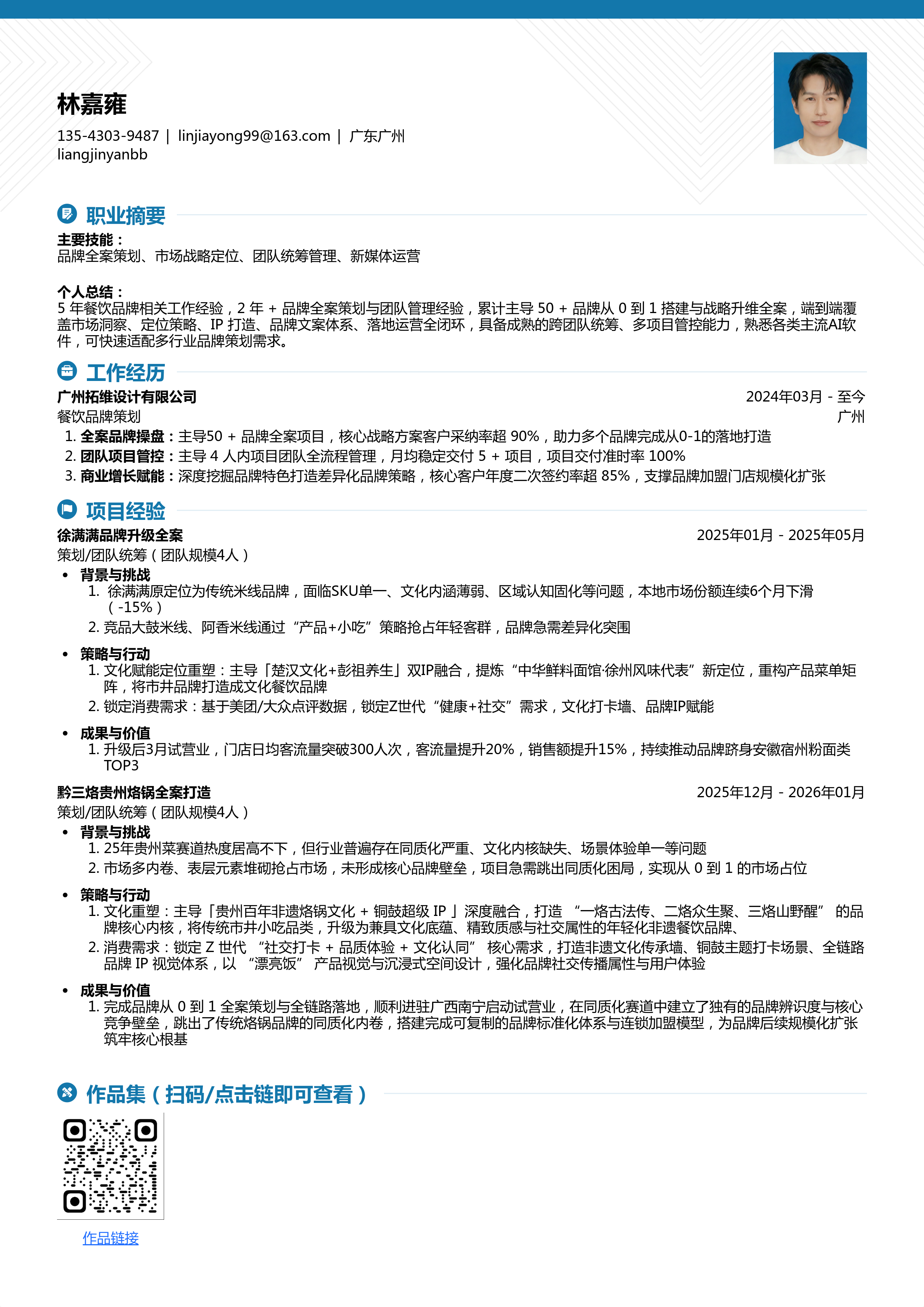 5年餐饮品牌相关工作经验,2年+品牌全案策划与团队管理经验,累计主导多个品牌从0到1搭建与战略升维全案。